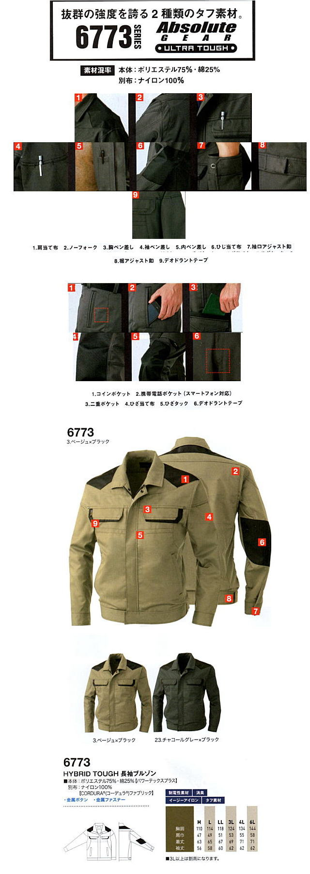 | 6773 長袖ブルゾン 素材 ポリエステル75%・綿25% サイズM~6L カラー 2色 本体価格 販売価格 ¥4,950円(税別)~ ※3Lから割高です ※メーカー在庫数限りです。 |